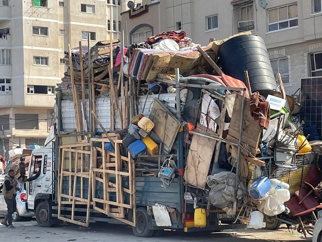 رحلة العودة الى الشمال مرهقة ومتعبة هذه السيارة مثقلة بالحمولة حيب تستمر الحافلات والمركبات والعربات في نقل الأمتعة من عند تبة النويري غرب مخيم النصيرات وسط القطاع، إلى حاجز 'نتساريم'، علماً أن الاحتلال كان يمنع أي شخص قبل يوم الأحد من اجتياز التبة. هؤلاء شكّلوا مشهداً مهيباً على امتداد شارع الرشيد الساحلي