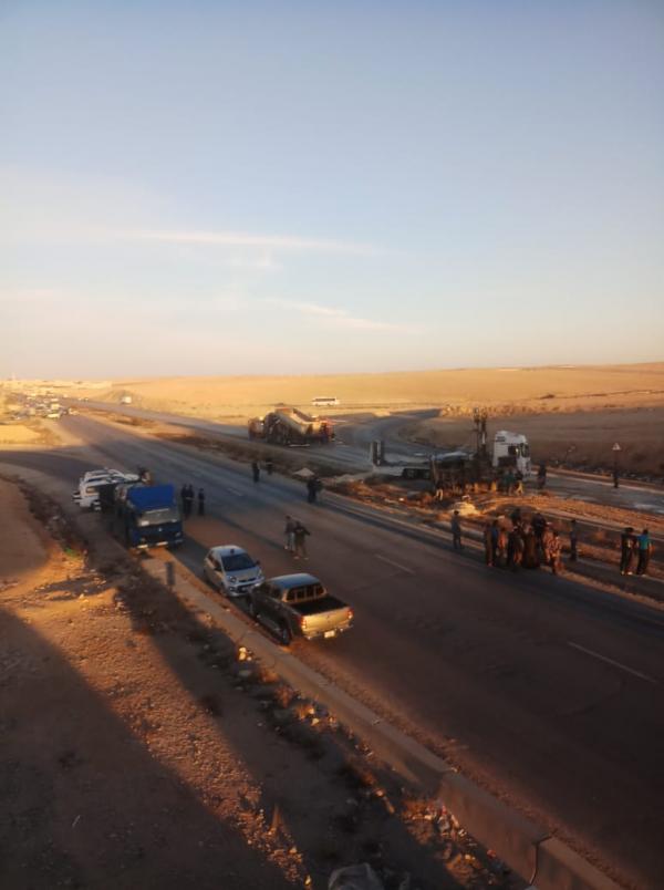 اصيب شخصين اثر حادث تصادم بين صهريج محمل بمادة التيون و مركبتين خصوصيتين تحت جسر الغباوي على اوتوستراد الزرقاء - المفرق.