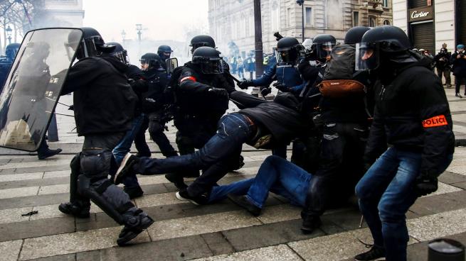 وبرزت شعارات 'ماكرون استقالة'، و'ماكرون يحتقر الناس البسطاء'، في الاحتجاجات، وأحصت وزارة الداخلية، في الساعة الواحدة من بعد ظهر أمس، 31 ألف متظاهر، من بينهم 8 آلاف في العاصمة، أي أقل من عدد الأسبوع الماضي. وقد أدت الاعتقالات الاستباقية، التي بدأت مساء أول من أمس وصباح أمس في محطات القطارات والمداخل إلى أماكن التظاهر، إلى إيقاف أكثر من 700 شخص في عموم فرنسا، أكثر من 600 منهم في العاصمة وحدها، قبل بدء التجمعات حتى. وعلى الرغم من وصول المتظاهرين إلى الشانزليزيه في الساعة السادسة صباحاً، إلا أن الوضع ظلّ نسبياً تحت السيطرة الأمنية، مقارنة بالسبت الماضي، رغم بعض المجابَهات التي استخدمت فيها الشرطة خراطيم المياه والقنابل المسيلة للدموع، ولم يعكره سوى إقدام بعض المتظاهرين على إشعال النار في القمامة وفي بعض أغصان الشجر، وهو ما تصدت له على الفور خراطيم المياه. لكن سجل يوم أمس مستوى عنف من رجال الأمن أعلى من الأسبوع الماضي، مع انتشار ظاهرة إطلاق الشرطة الرصاص المطاطي مباشرة على أجساد المتظاهرين، وهو ما ترجم بعدد كبير من المصابين والمعتقلين. وحاولت حشود المتظاهرين الزحف نحو القصر الرئاسي. وسدت مركبات مدرعة زرقاء اللون أسفل قوس النصر، ومنعت صفوف من رجال شرطة مكافحة الشغب، الذين يرتدون خوذات حماية، دخول المتظاهرين إلى شارع الشانزليزيه باتجاه قصر الرئاسة. وأحاطت حلقة فولاذية قصر الإليزيه نفسه، بينما تمركزت شاحنات الشرطة ووضعت الحواجز الحديدية في الشوارع بكافة أنحاء الحي.